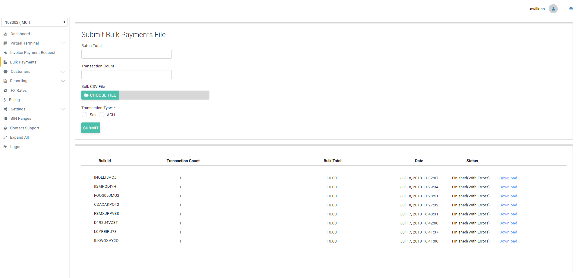 The Bulk Payments feature provides merchants with the ability to upload a CSV file of transactions for processing. This is especially useful in cases where a merchant does not process transactions one by one or a large volume of transactions need to be processed at one time.