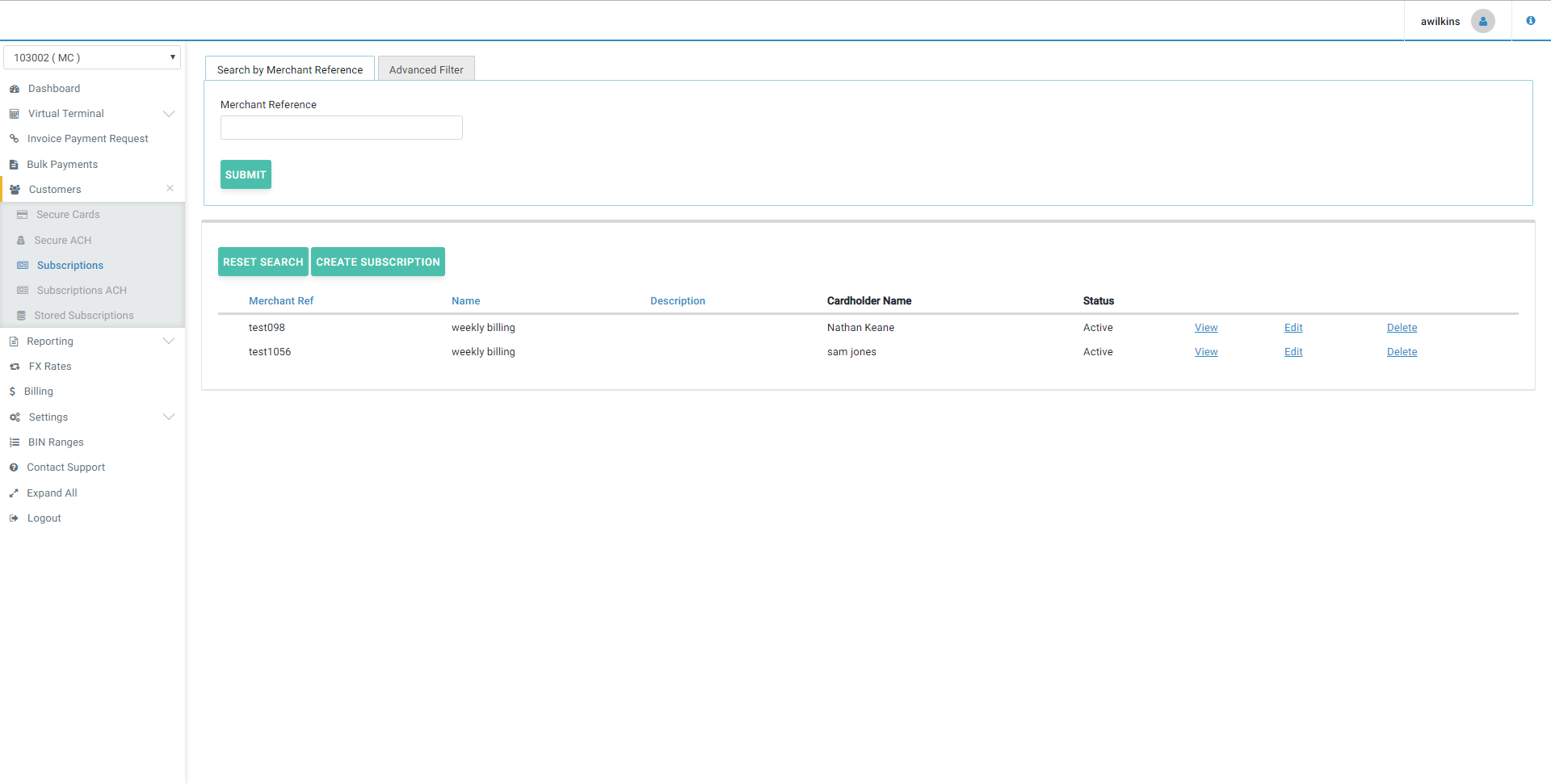 If you would like to set up a a new subscription, go to “Subscriptions” in the drop down menu. All the previously registered subscriptions are listed in this section, and you can view their details. You can also search for subscriptions by “Merchant reference” or by other criteria.