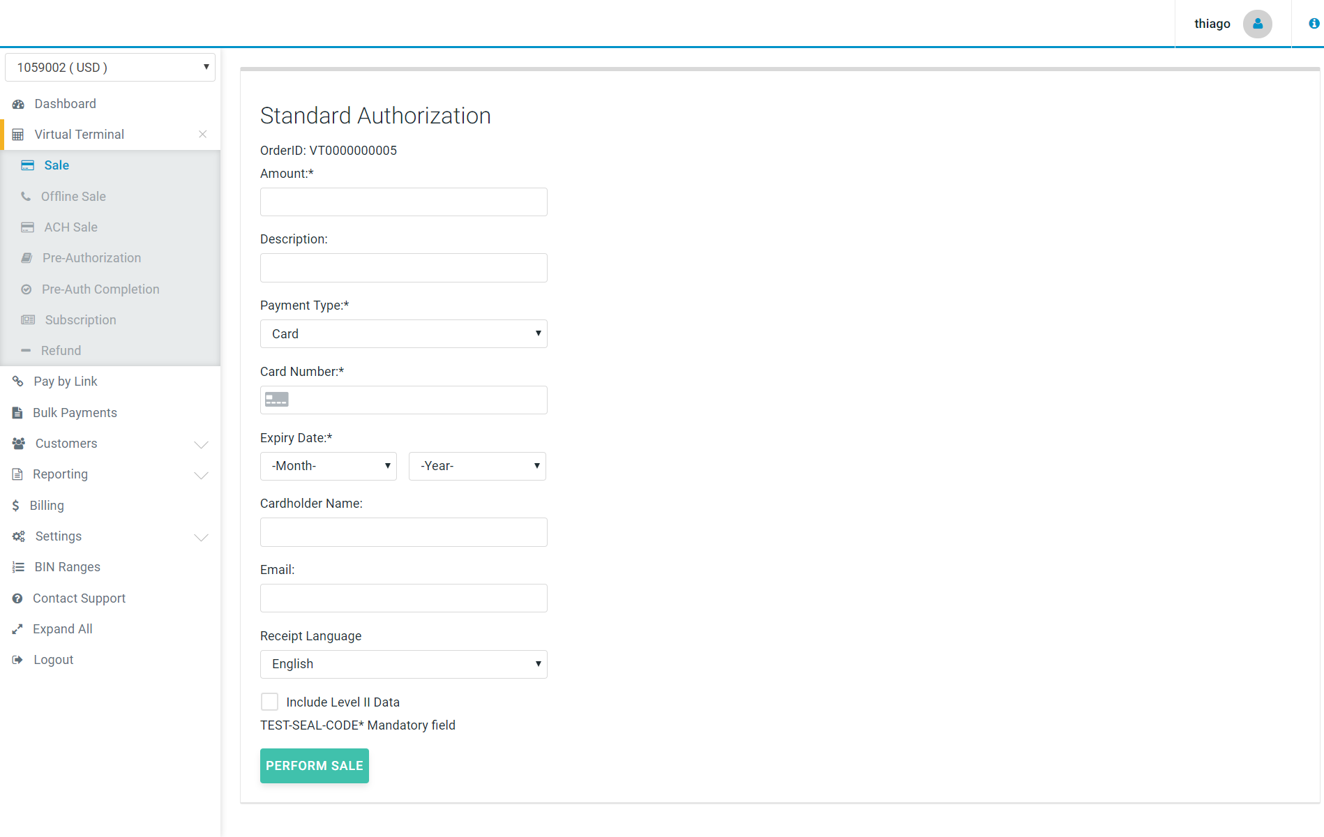 The Virtual Terminal provides merchants with the ability to execute manual card transactions. This is especially useful in a MOTO (Mail Order/Telephone Order) environment. The Virtual Terminal is accessible directly from the main menu.