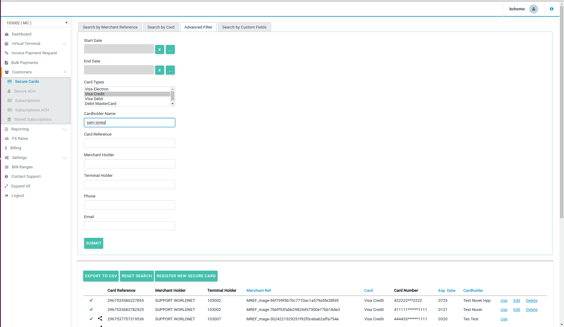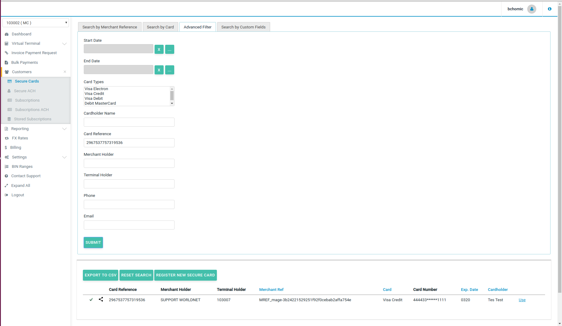 For Secure Card, you can “Search by Merchant Reference”, “Search by Card” or use “Advanced Filter”.