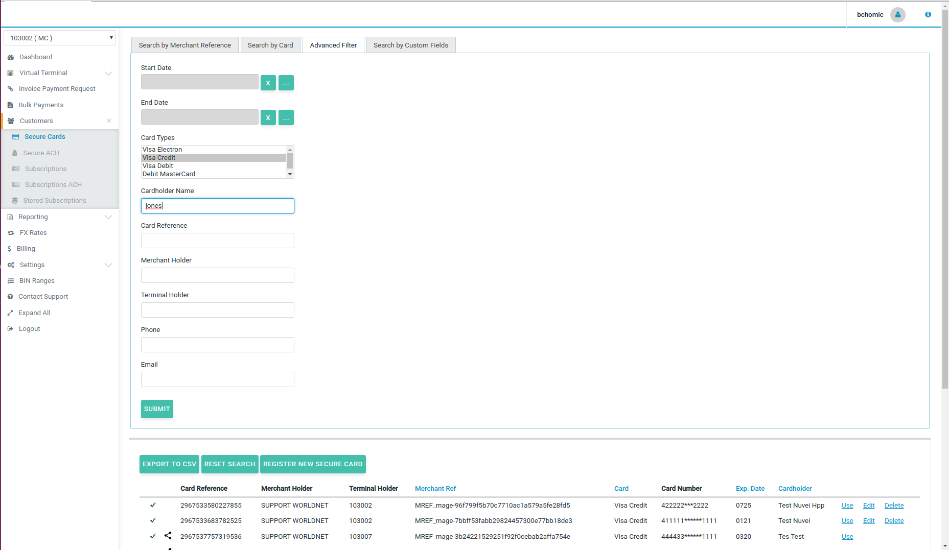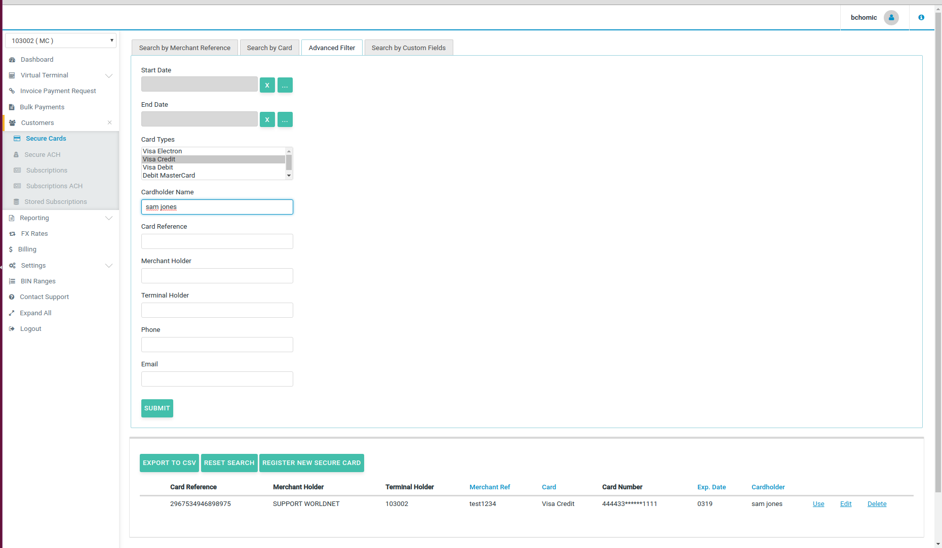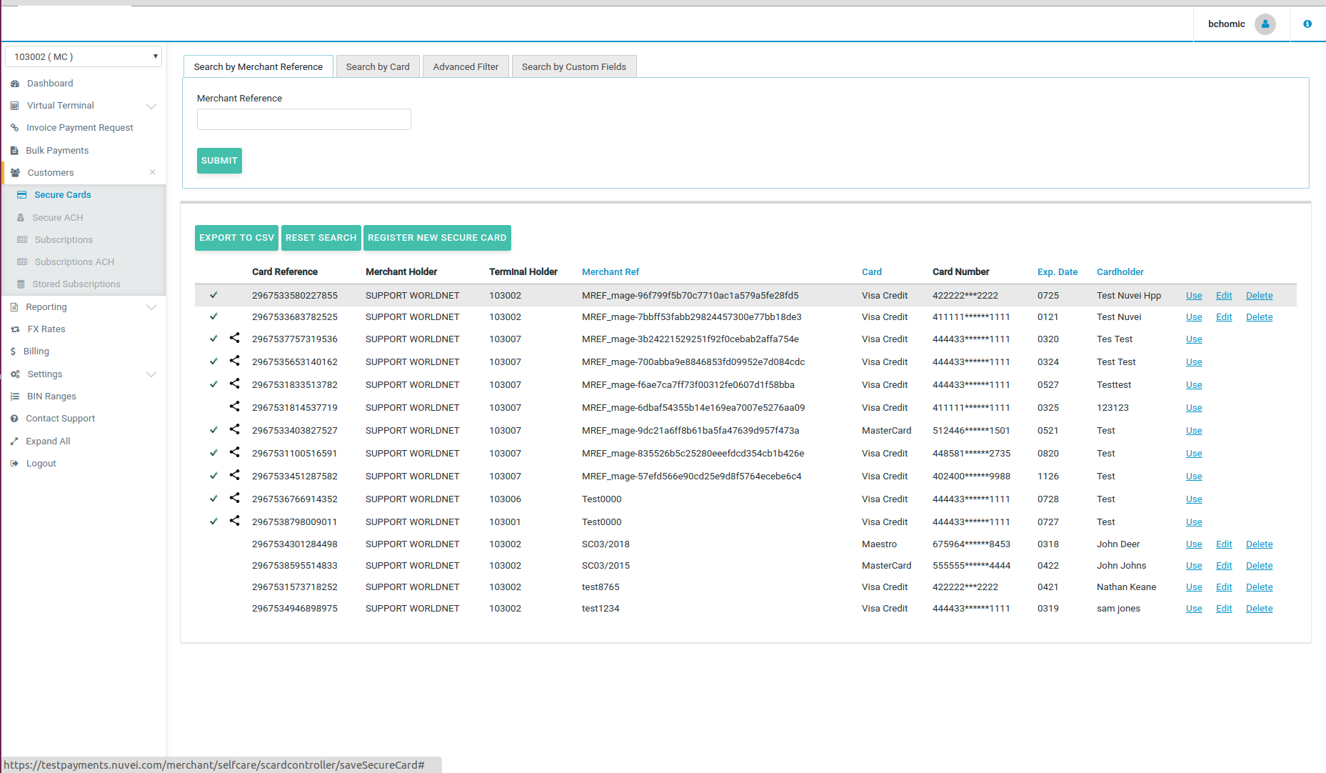 To search Secure Cards by Merchant Reference, you just need to put the full merchant ref number in the field and click on “Submit” button.