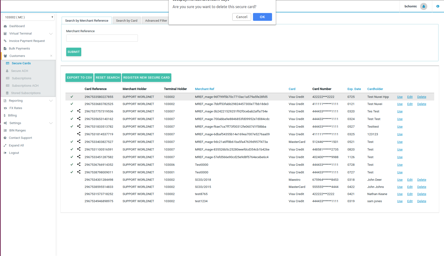 Please note that the system will not allow you to delete a secure card which has been already used to create a subscription.