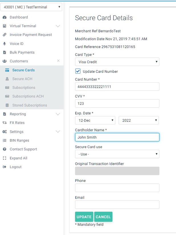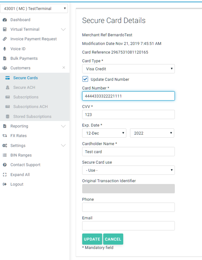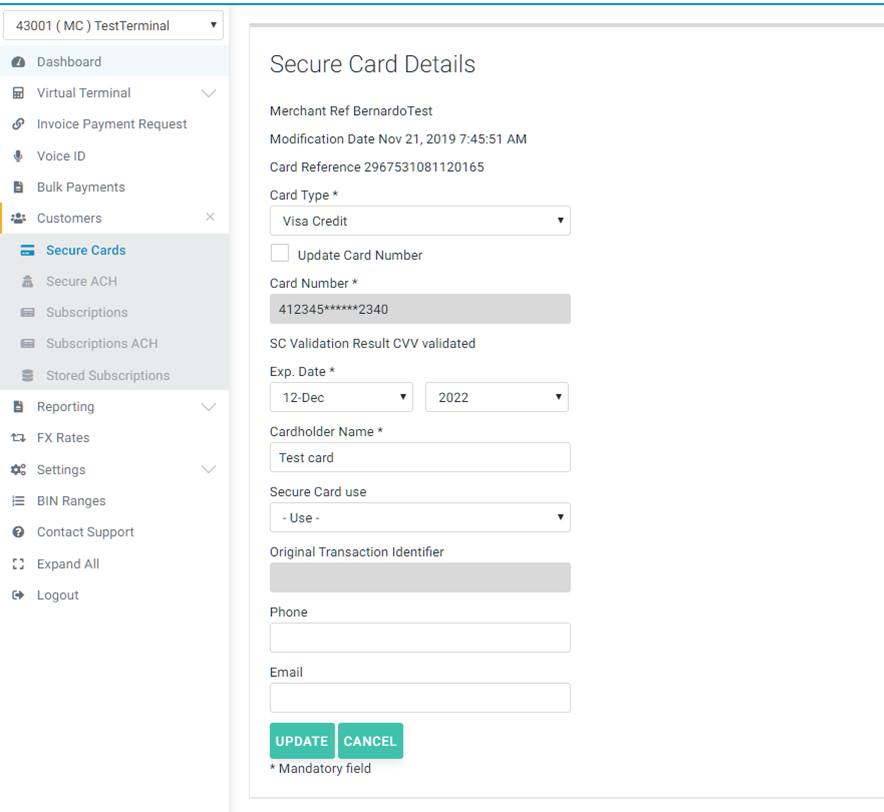 Please note that you are not able to amend the Merchant Ref, modification date and Card Reference.