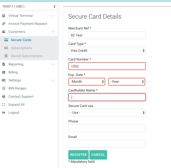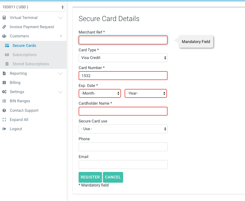 To register a new secure card go to the “Secure Cards” feature and choose “Register New Secure Card” button. Then fill in the card details and make sure that you complete all the fields.