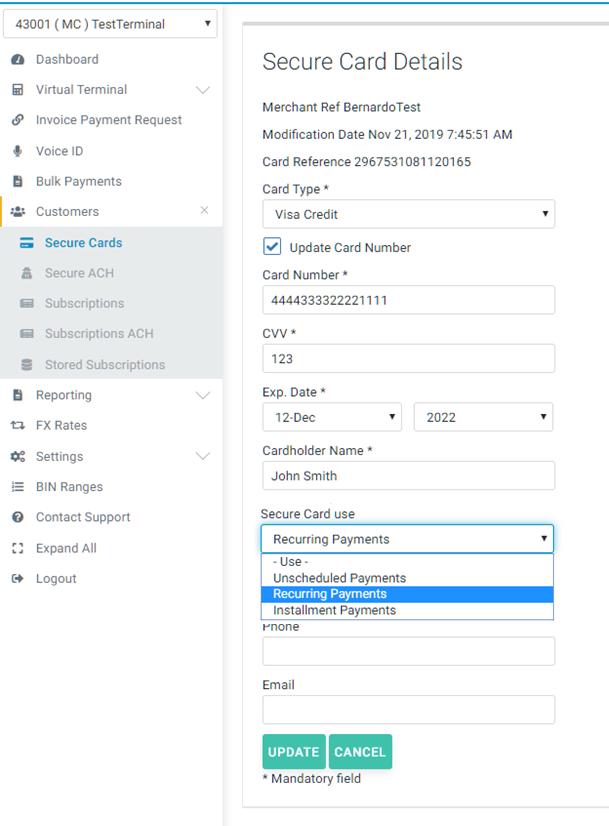Secure Cards are useful for merchants which are required to perform regular payments without the card holders entering their information.