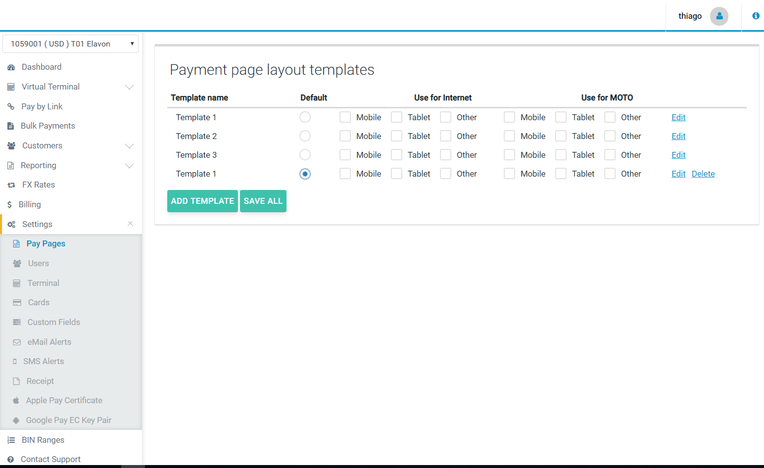 Also, different templates can also be used for Mail Order (MOTO) and eCommerce transactions (WEB).