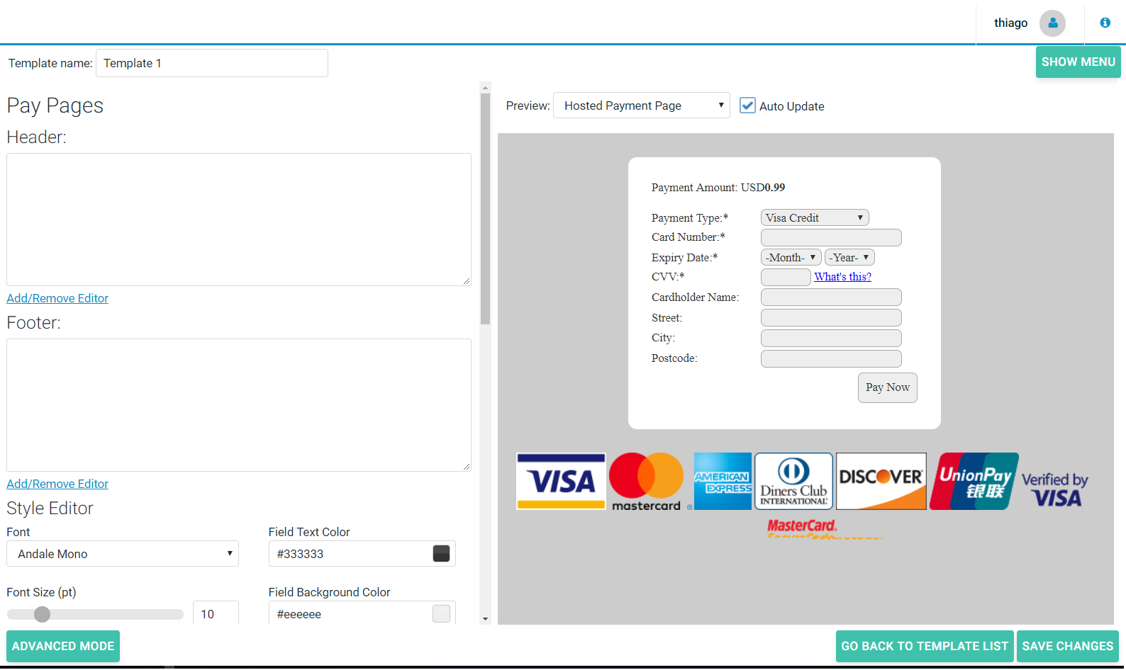 Basic template styling requires no knowledge of HTML or CSS. It can allow a merchant to style the page on their own. Previews of all hosted pages can be viewed on the right hand side.