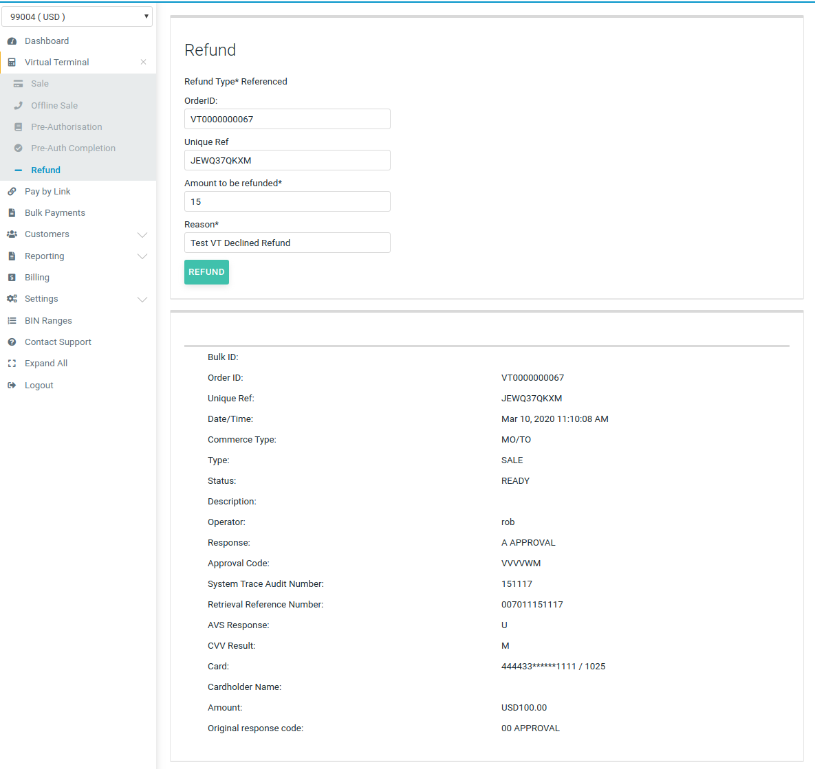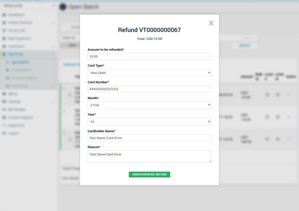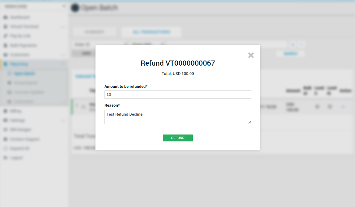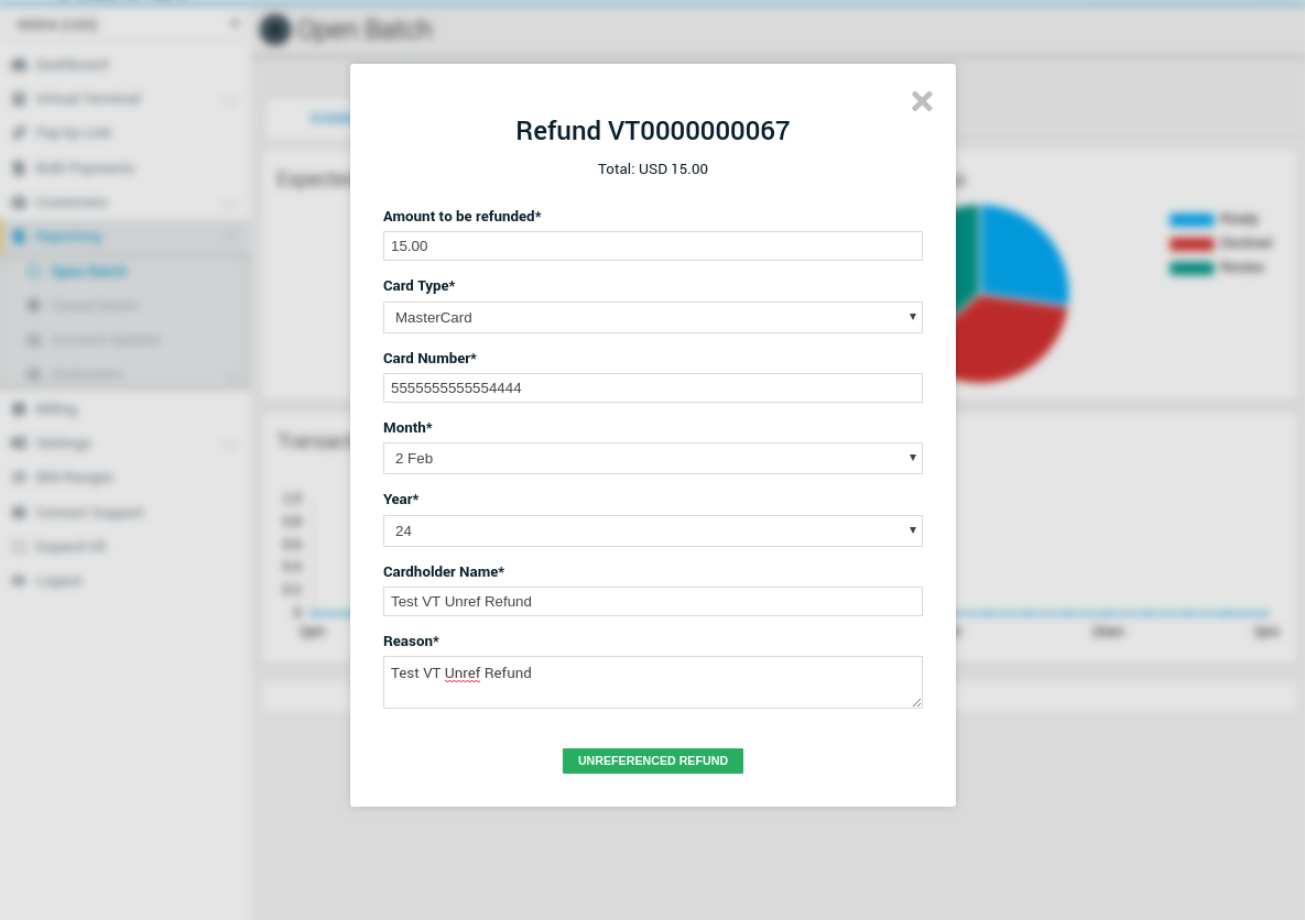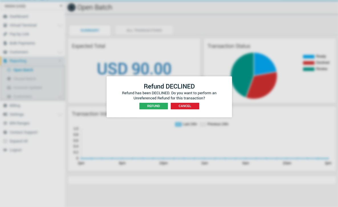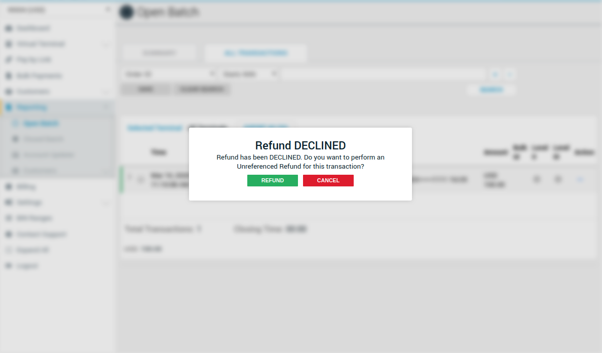 This feature allows merchants to perform an Unreferenced Refund for an Online Refund that may have been Declined by their Acquirer. Once the support team has enabled this feature for a merchant's terminal, the merchant will be able to perform an Unreferenced Refund whenever an Online Refund Declines, whether it be from the Virtual Terminal Refund Page, the Open Batch, or the Closed Batch refunds.