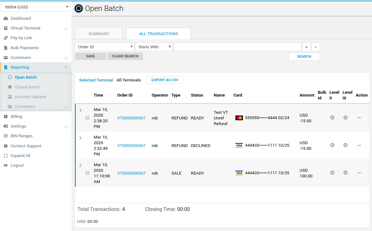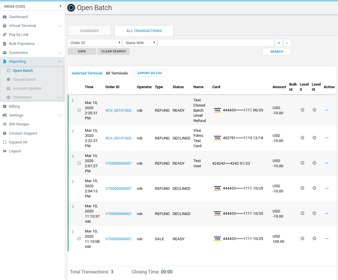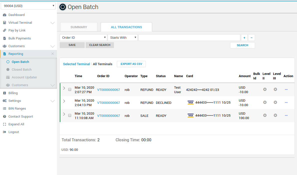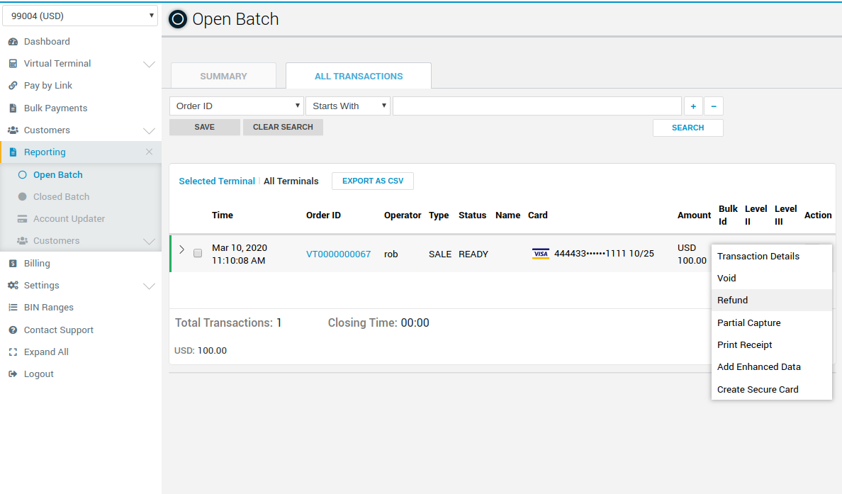 6. Closed Batch - Unreferenced Refund is completed and viewable in Open Batch.