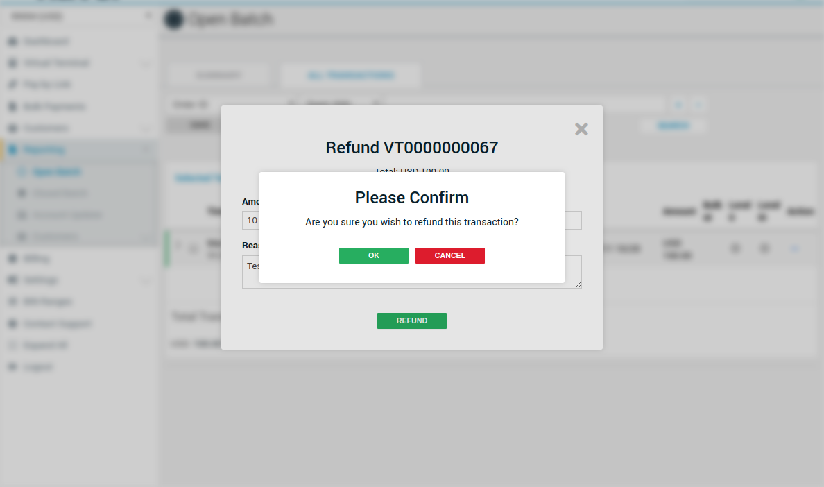 2. Open Batch - Perform Refund (in the example below it is $10 out of a possible $100)