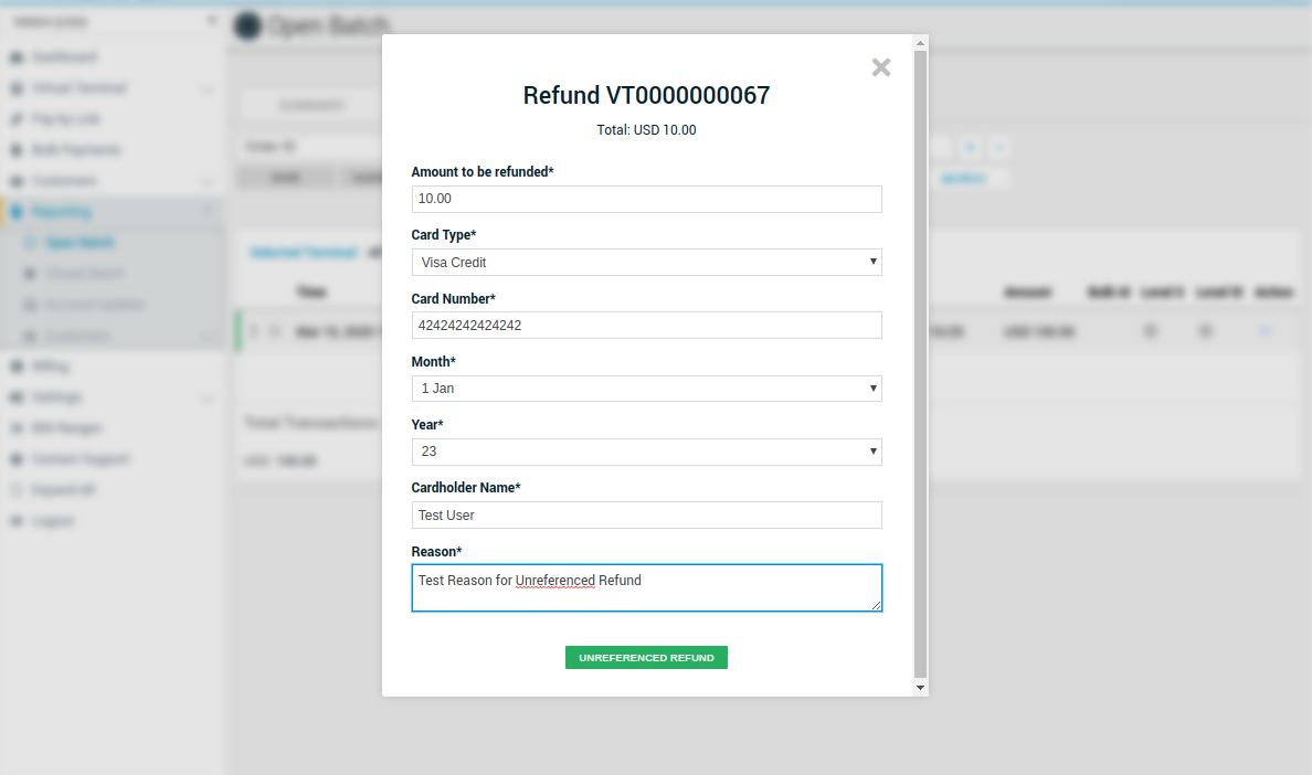 6. Open Batch - Perform Unreferenced Refund and view transactions in open batch.
