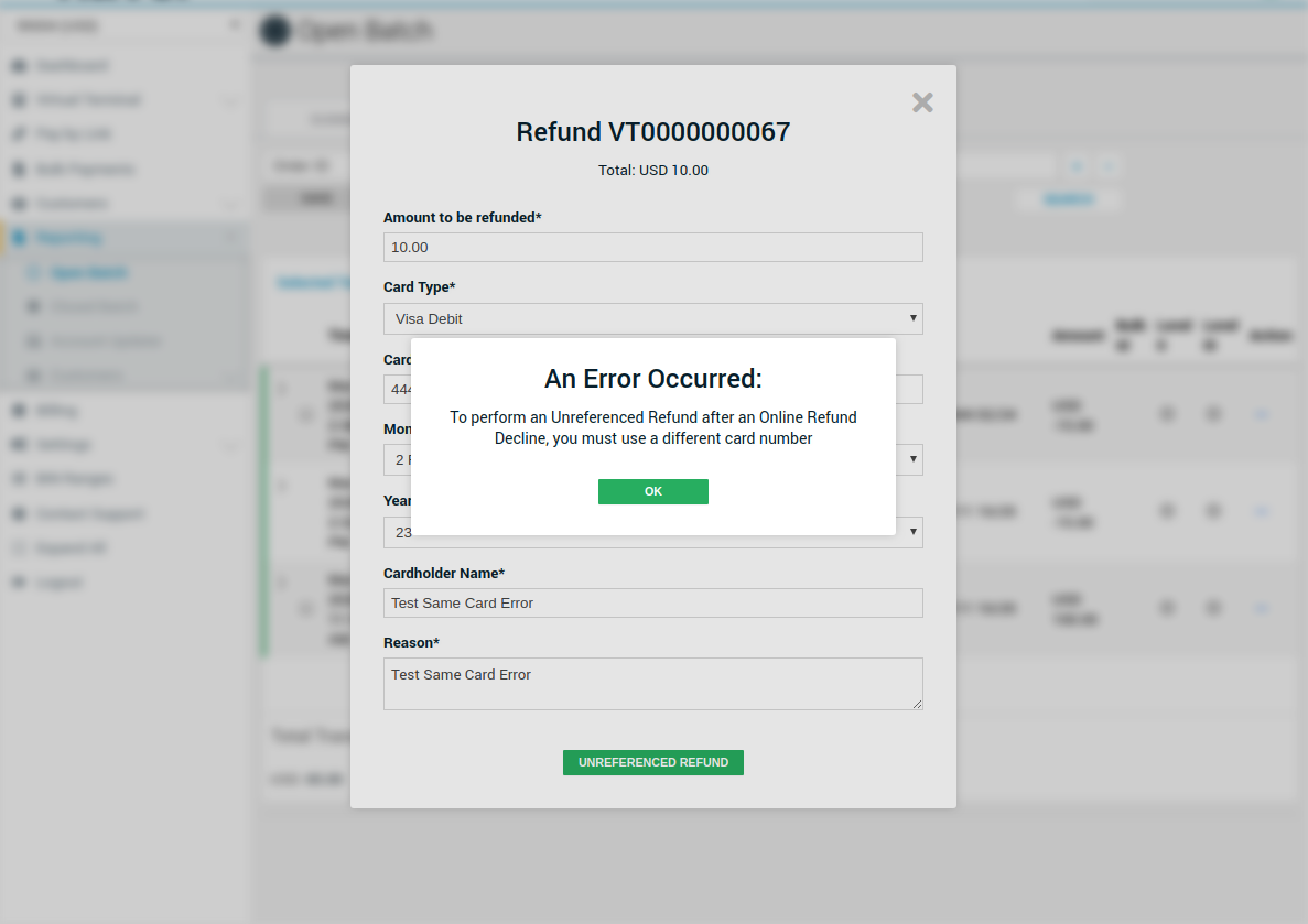 The Unreferenced Refund After Online Refund Decline does not allow the user to use the same card number as the original Declined Refund. If the same card is used, the following error appears: