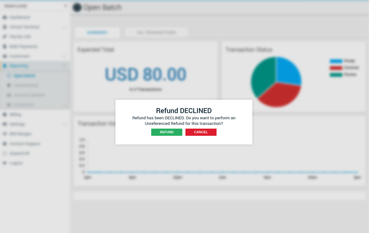 4. Open Batch - Refund is Declined. Option to perform an Unreferenced Refund is provided.
